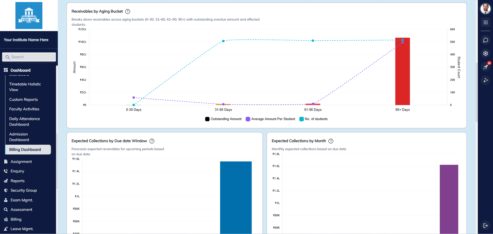 - Real-time dashboards for academic, financial, and operational KPIs with drill-down capabilities.