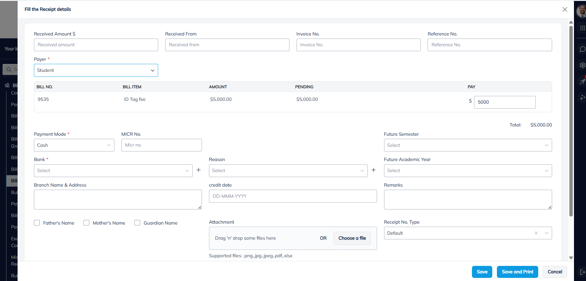Administrators can generate receipts for fee payments quickly and effortlessly, ensuring transparency and convenience for students and parents.