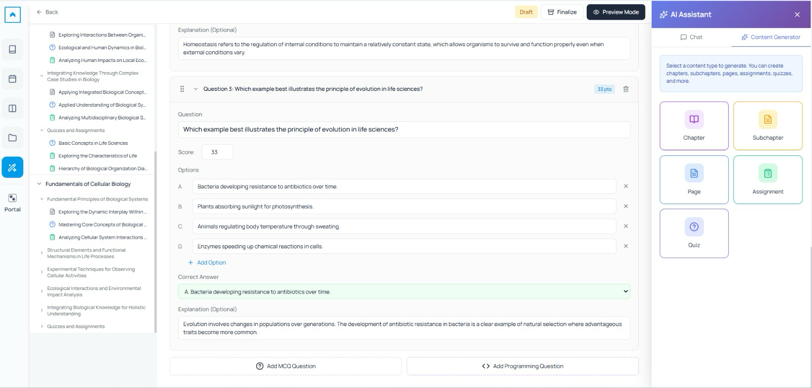 Embedded directly within the LMS, the AI content studio enables teaching faculty to generate high-quality course content effortlessly.